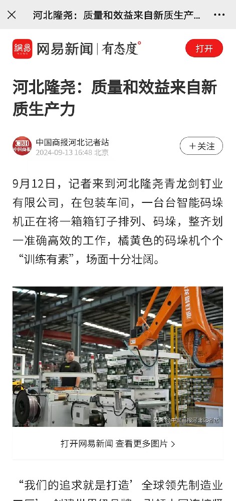 近日,河北省工業和信息化廳,公布了河北省專精特新中小企業擬復核通過企業名單,河北青龍劍釘業有限公司憑借突出表現、過硬實力,順利通過河北省“專精特新”中小企業審核認定。此次“專精特新”中小企業復審的順利通過,是再次對企業創新能力、研發水平、知識產權以及行業引領作用等多維度的極高認可,青龍劍釘業榮[詳情] 2024-08-01 10:07:41